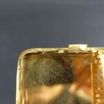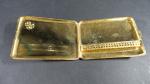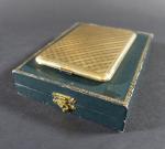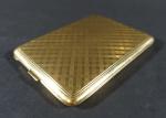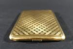 Boîte à cigarettes en or 750 millièmes à motifs gravés de croisillons, fermoir serti d'un ligne de saphirs calibrés, l'intérieur avec barrette ajourée et chiffre gravé, porte un numéro 1235720. Poids : 178,30 g - Long. : 11,5 cm - Prof. : 8,5 cm - Prof. : 0,9 cm