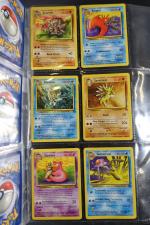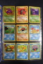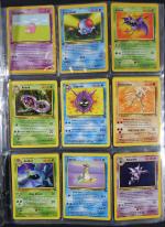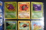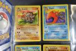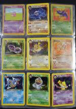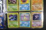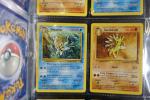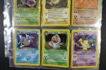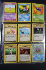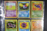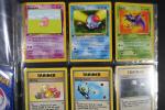 POKEMON. Lot de 34 cartes comprenant : Assortiment de 29 cartes de l'Extension FOSSIL en Anglais, Fabriquées par Wizards en 1999 comprenant : Lapras, Haunter, Hitmonlee, etc... Etat : B+ (correspondant à EXCELLENT). Légèrement curvées. ON JOINT : POKEMON. Assortiment de 5 cartes de l'Extension TEAM ROCKET en Anglais, Fabriquées par Wizards en 1999 comprenant : Dark Hypno, Dark Gyarados, Dark Arbok (Etat : B+ avec Preasure Mark correspondant à EXCELLENT) et Raichu Obscur et Mackogneur Obscur (Etat : D+ correspondant à POOR). Légèrement curvées.. NB: Etat des cartes visible sur les photos de détails, possibilité d'envoyer sur demande d'autres photos si besoin, nous recommandons de venir examiner le lot sur place lors de l'exposition.