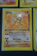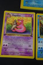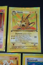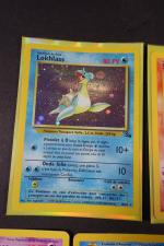 POKEMON. Assortiment de 7 cartes en 1ere Edition et Unlimited de l'Extension FOSSIL en Français, fabriqué par Wizards en 1999 comprenant 5 cartes en 1ere Edition comprenant Metamorph, Flagadoss, Kicklee, Raichu, Amonistar Etat : C (correspondant à PLAYED) et Sulfura Etat : C (correspondant à PLAYED), Lokhlass en Edition Unlimited Etat : C+ (correspondant à LIGHT PLAYED). NB: Etat des cartes visible sur les photos de détails, possibilité d'envoyer sur demande d'autres photos si besoin, nous recommandons de venir examiner le lot sur place lors de l'exposition.