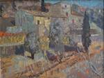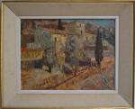 KENVELLE (XXème) Paysage aux maisons, 1959. Huile sur panneau signée et datée en bas à droite 43 x 57 cm