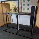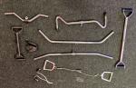 Support pour barre avec différentes barres simples pour curl, triceps, et poignées pour tirage et travail poulie, avec bâton pour échauffement, étirement