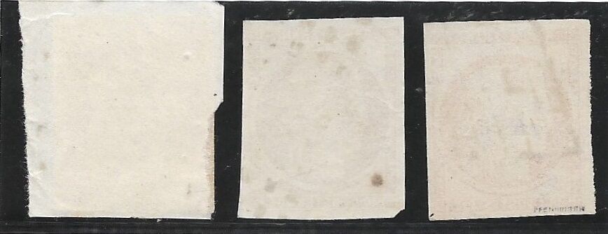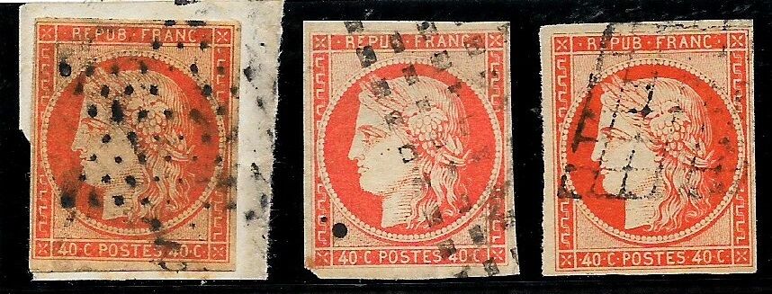 France n°5+5a+5b, trois nuances différentes du Cérès 40 c orange avec trois types d'oblitérations différentes, cote totale 1800. N°5 orange oblitéré Etoile sur petit fragment, TB + N°5a orange vif oblitéré Gros points, TB + N°5b orange foncé oblitéré Grille, léger clair, signé Pfenninger