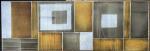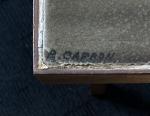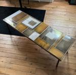 Roger CAPRON (1922-2006) Table basse rectangulaire à plateau de carreaux de céramiques gris, camel et blanc sur une structure et piétement en fer H.: 30 cm L.: 121 cm P.: 41 cm