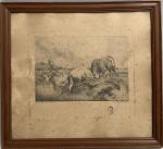 Jean CORABOEUF (1870-1947) Combat de taureaux, d'après le tableau de Brascassat Gravure signée en bas à gauche 31 x 34.5 cm à vue (piqûres)