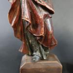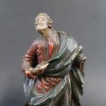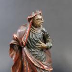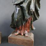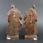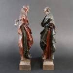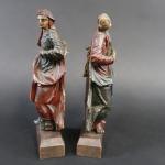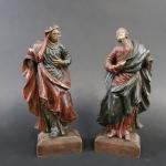 Paire de statuettes représentant Saint-Jean et la Vierge au Calvaire en bois sculpté polychrome, ép. XVII's. Haut. : 23 cm, sur socle bois postérieur. Haut. totale : 26 cm