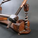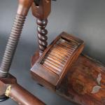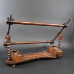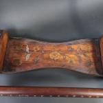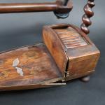 Métier à broder d'époque XVIII's, le plateau en bois de placage marqueté de branches de fleurs et deux petits casiers latéraux à rideaux, montants torsadés supportant le cadre. Long. : 0,64 m - Haut. : 0,30 m - Prof. : 0,46 m (petits accidents et manques)