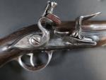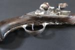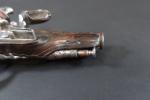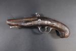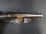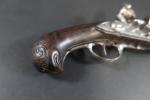 Petit pistolet de poche à silex, canon rond à pans au tonnerre, platines gravées et marquées Paris, crosse en noyer sculpté d'une tête d'oiseau et de rinceaux, chien en col de cygne, ép. fin XVIII's. Long : 18 cm