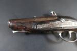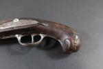 Petit pistolet de poche à silex, canon rond à pans au tonnerre, platines gravées et...