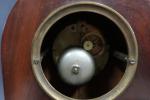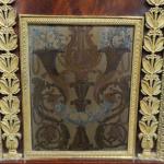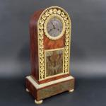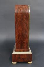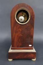 Pendule borne d'époque Restauration en placage d'acajou et frise de feuilles de laurier en encadrement, ornée de deux plaques en laiton à décor polychrome gravé à l'acide de cornes d'abondance, lyre, rinceaux, palmettes, etc... Haut : 45 cm