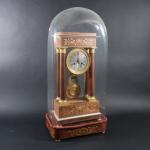 Pendule portique d'époque Charles X en bois de placage marqueté de branches fleuries, balancier lyre à compensation. Haut. : 50 cm, sous globe à contre-socle marqueté