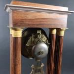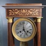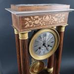 Pendule portique d'époque Charles X en bois de placage marqueté de branches fleuries, balancier lyre...