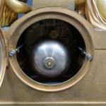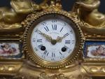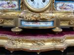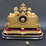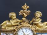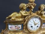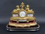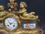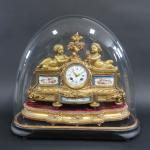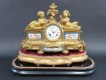 Pendule d'époque Napoléon III en bronze doré à décor de deux enfants autour d'un papillon et d'un vase de fleurs, ornée de plaques en porcelaine à décor polychrome d'amours et de fleurs. Haut : 30 cm, sur socle en bois stuqué doré à plateau en velours, et présentée sous globe à socle en bois noirci