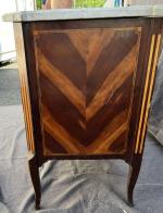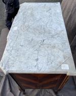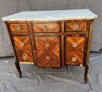 COMMODE en bois de placage et marqueterie ouvrant à trois tiroirs sur trois rangs dont deux sans traverse, ressaut central, dessus de marbre à épaulement