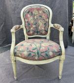 FAUTEUIL en bois sculpté, mouluré et rechampi de forme cabriolet, estampillé P. Pluvinet Epoque Louis XVI H.: 90 cm l.: 59 cm P.: 51 cm (état médiocre) Pierre Joseph PLUVINET, reçu maître ébéniste en 1754