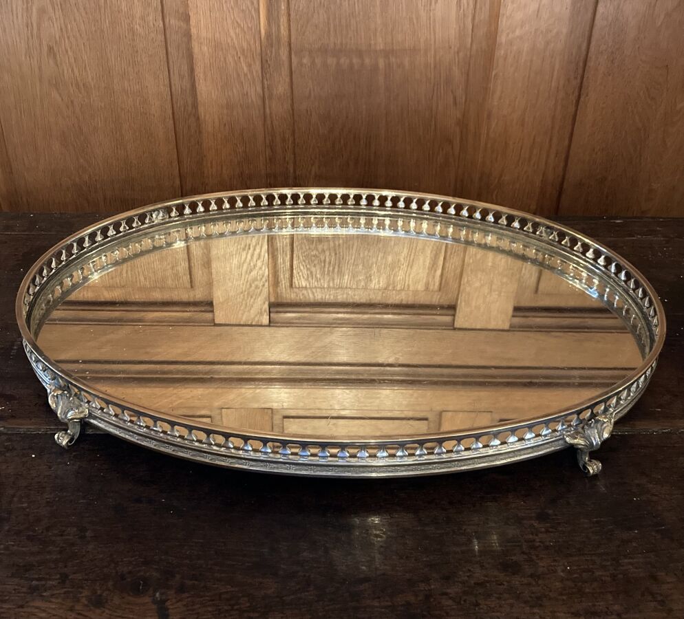 dans le bureau, CENTRE DE TABLE ovale en bronze argenté, foncé de glace 51 x 33 cm