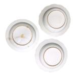 CHINE Compagnie des Indes Trois assiettes rondes et creuses en porcelaine à décor famille rose XVIIIème D.: 22 à 23 cm (fêles, éclats et restaurations)