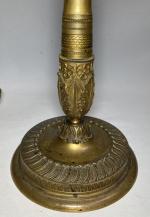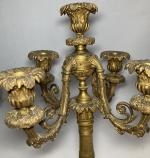 Paire de CANDELABRES en bronze doré à cinq bras de lumière à décor de feuillage, enroulements, feuilles lancéolées, couronnes XIXème H.: 41 cm (un binet à refixer)