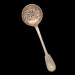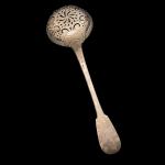 CUILLERE A SAUPOUDRER en argent, modèle uniplat, la bordure du cuilleron moulurée de filets, chiffrée XVIIIème, probablement Troyes L.: 23.5 cm Poids: 122 gr
