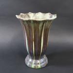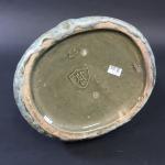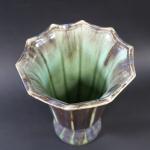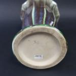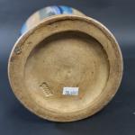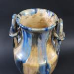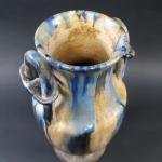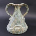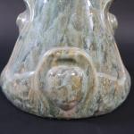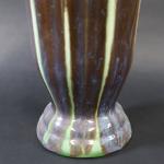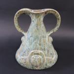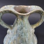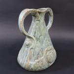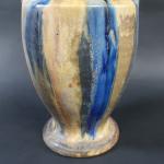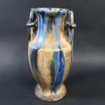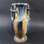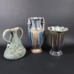 Trois vases en grès émaillée coulures, l'un de forme triangulaire à anses latérales et décor en relief d'écussons et cabochons, marqué. Haut : 27 cm ; un de forme amphore à épaulement et anses latérales, marque en creux "Renault Argent" (Cher). Haut : 34,5 cm ; le troisième évasé à pans coupés sur piédouche. Haut : 26 cm