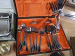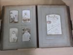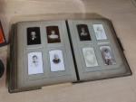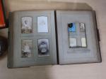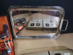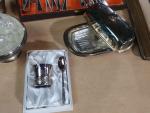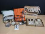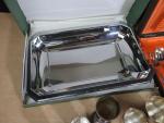 Plateau de service à 2 anses (long : 50 cm) , JEAN COUZON, ménagère de couverts à poisson en inox, belle coupe en inox ( long : 34 cm) , timbales et verres à liqueurs en métal argenté, dessous de bouteille, beurrier, couverts de baptême en métal argenté. ON JOINT : un album photos de famille années 1900