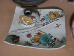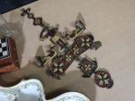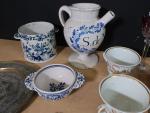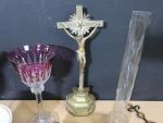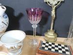 Lot de bonne brocante comprenant : vaisselle en céramique, crucifix en bronze XIXè, verre à vin en cristal de St Louis teinté violet, signé et en bon état, plat mendiant en porcelaine fin XIXè, encrier en faïence marqué G.D PARIS vers 1900, médaillon porte-photo en métal argenté vers 1900, broche en porcelaine de Limoges, seau rafraichissoir en faïence fin XIXè décoré bleu et blanc. (usures)