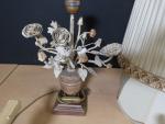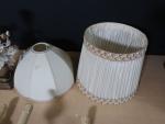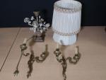 Lot comprenant : Paire d'appliques en bronze de style rocaille, pied de lampe moderne a décor de roses et deux abat-jours.