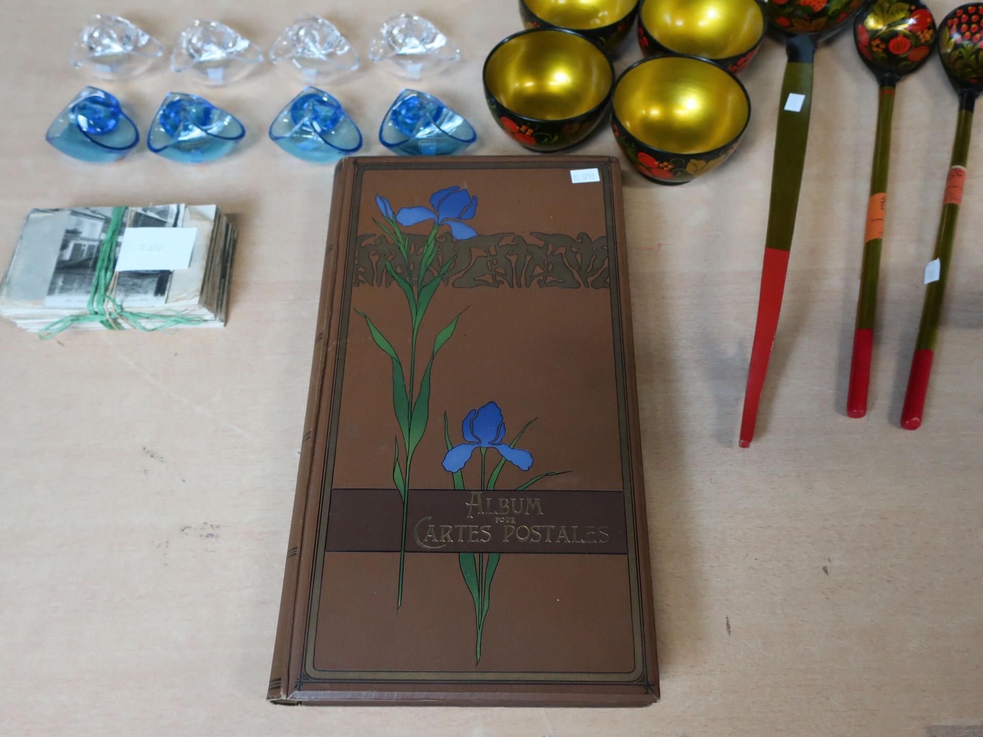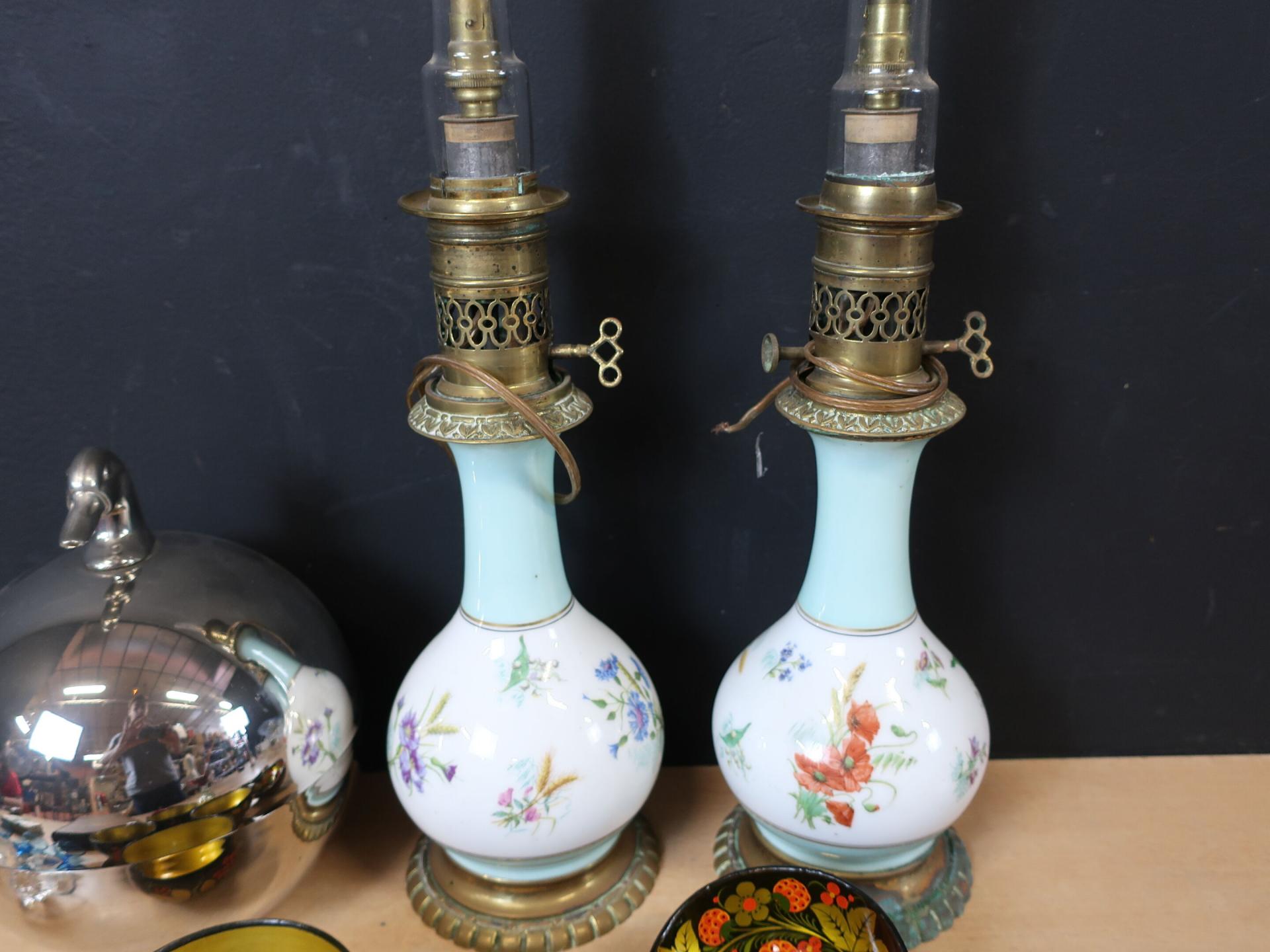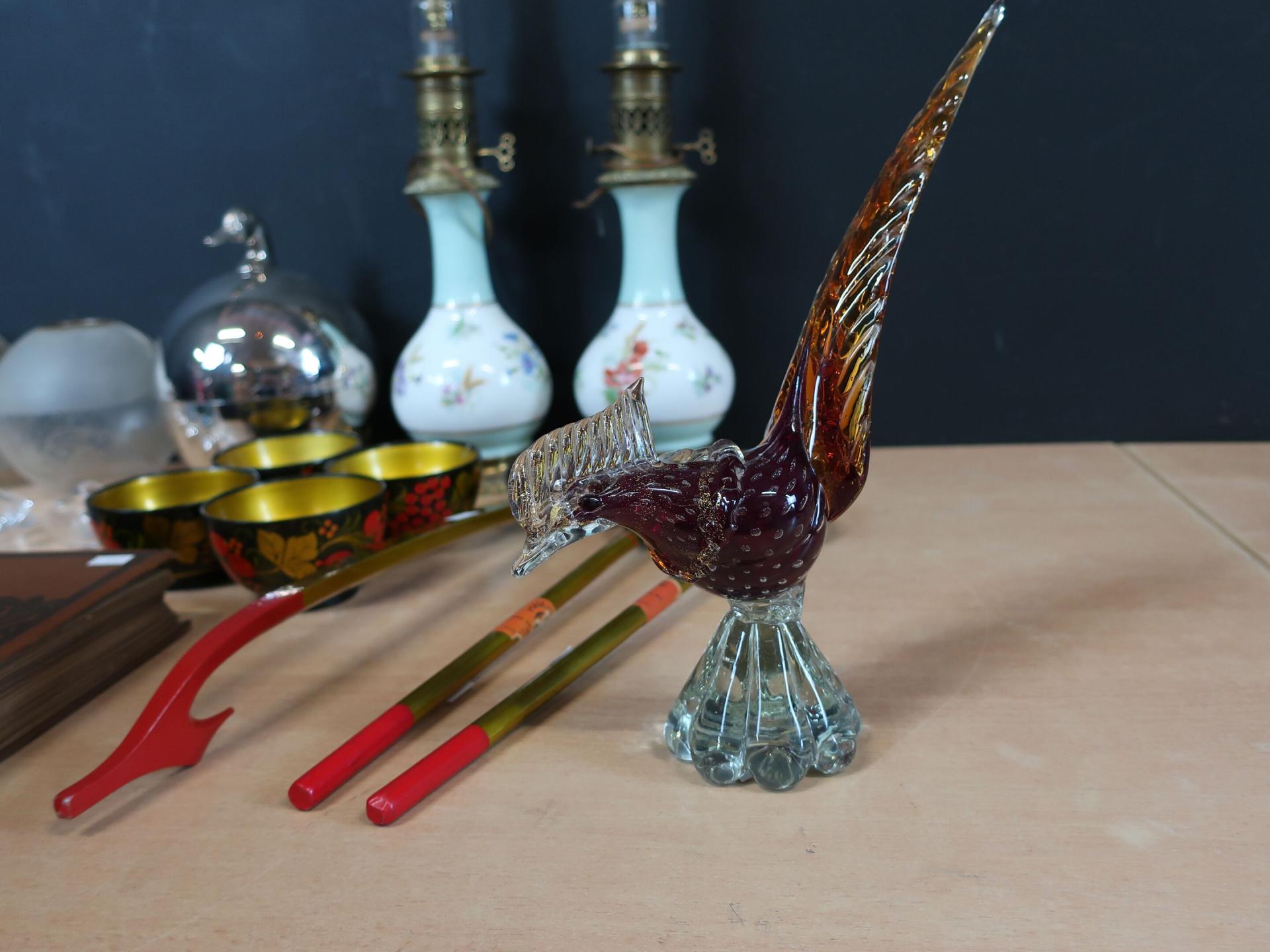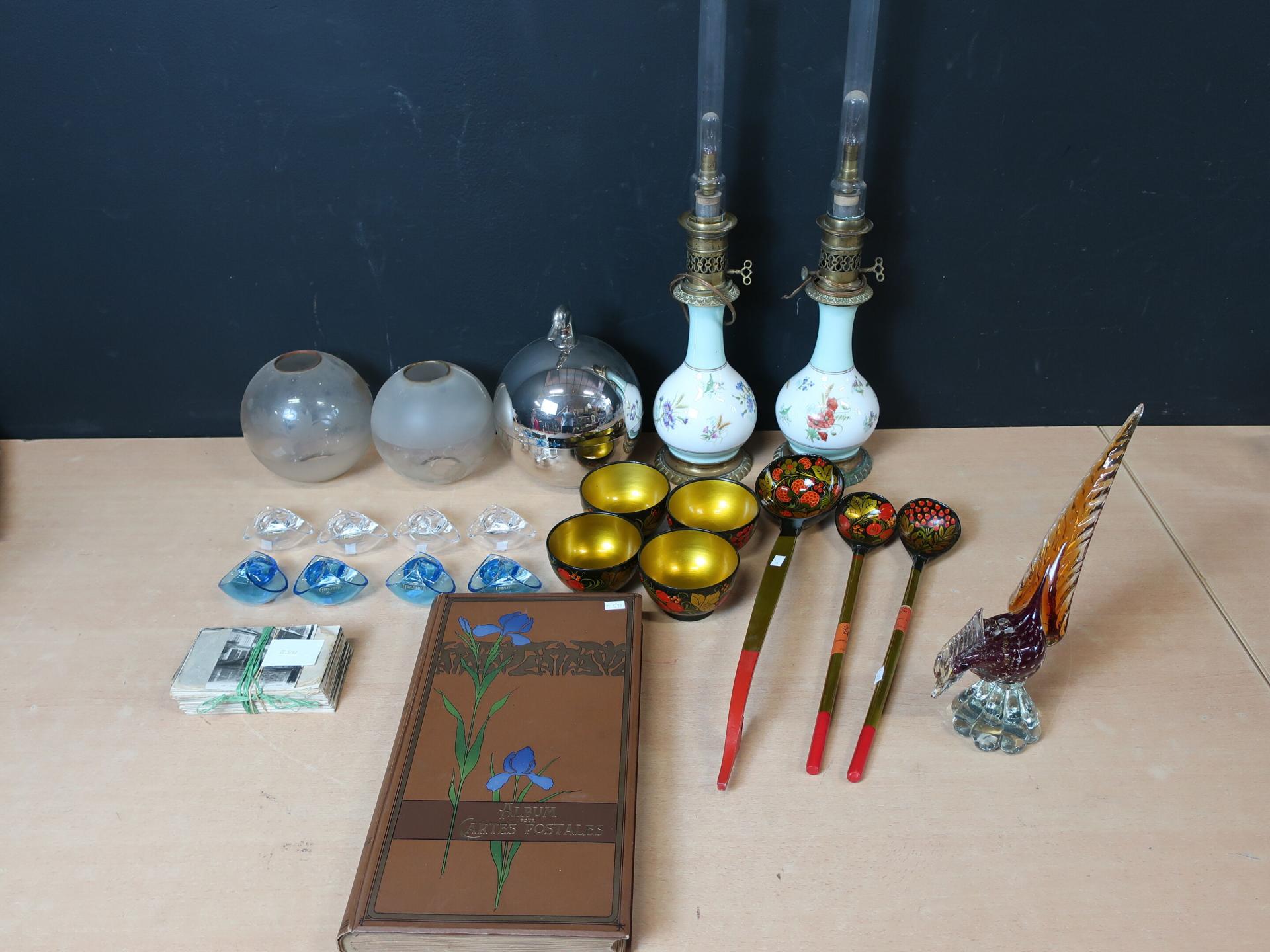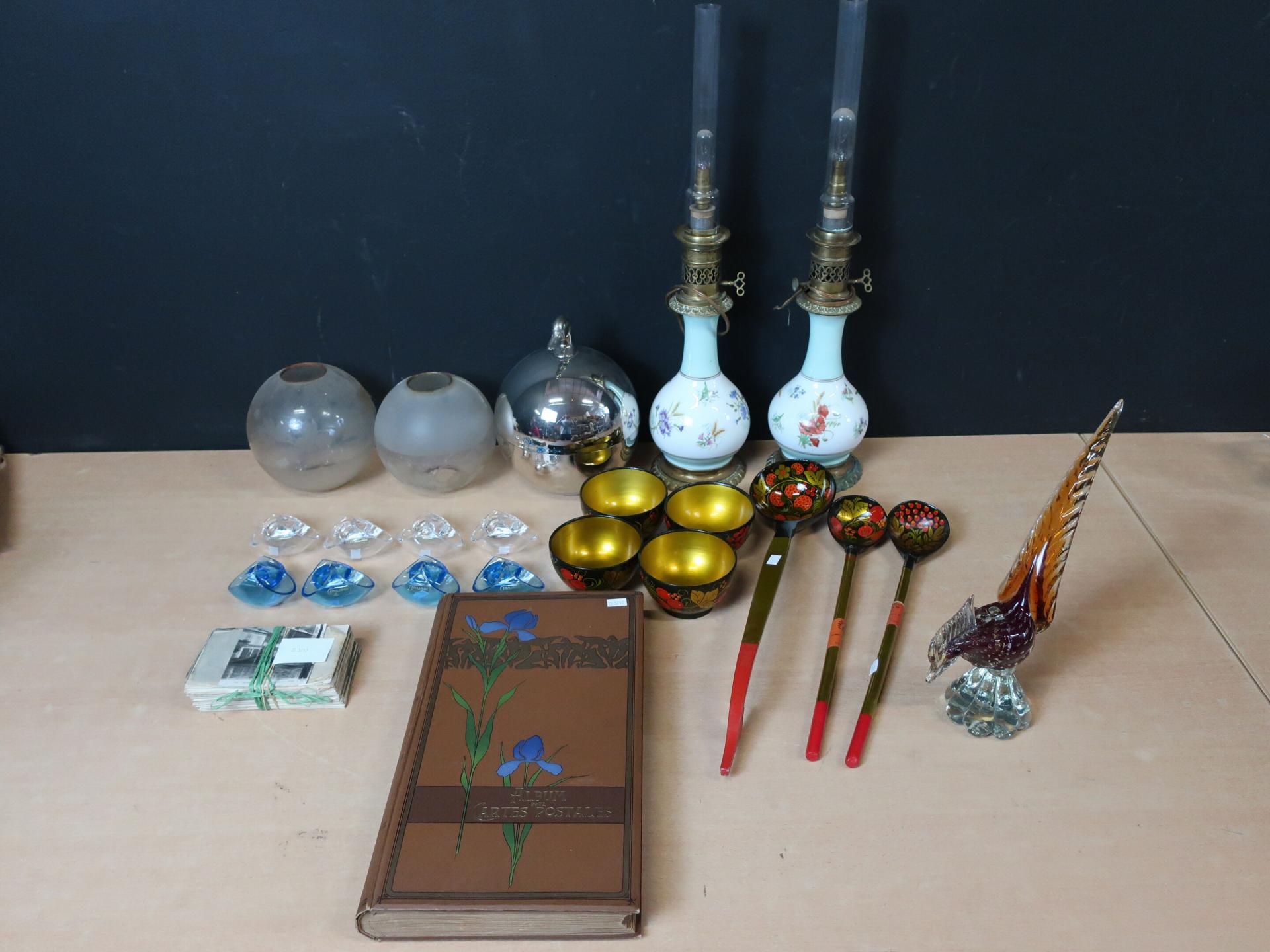 Lot d'objets divers comprenant : paire lampes à pétrole avec pied de lampe en porcelaine et laiton (haut: 57cm), un album de cartes postales et petit lot de cartes postales, 3 louches en bois laqué japonais et 4 bols, un oiseau en verre de Murano teinté, 2 globes en verre, une boite isotherme ronde à tête de canard et 8 ronds de serviette de couleur bleus et blancs en plastique.