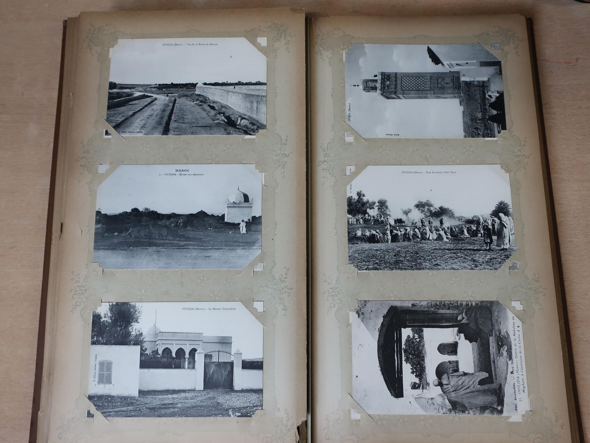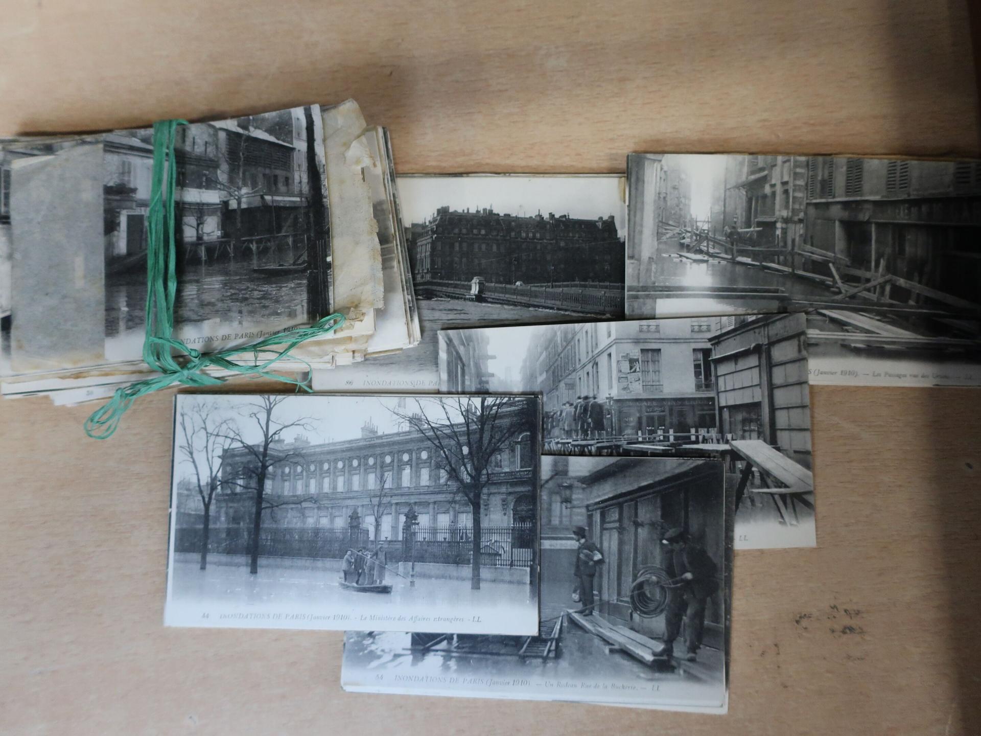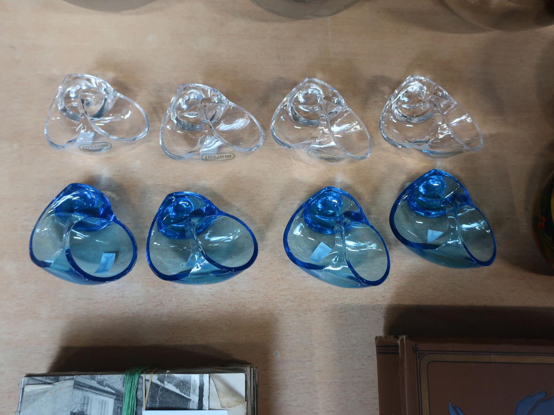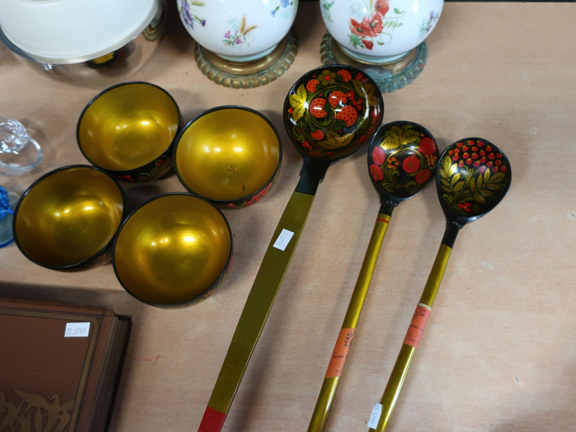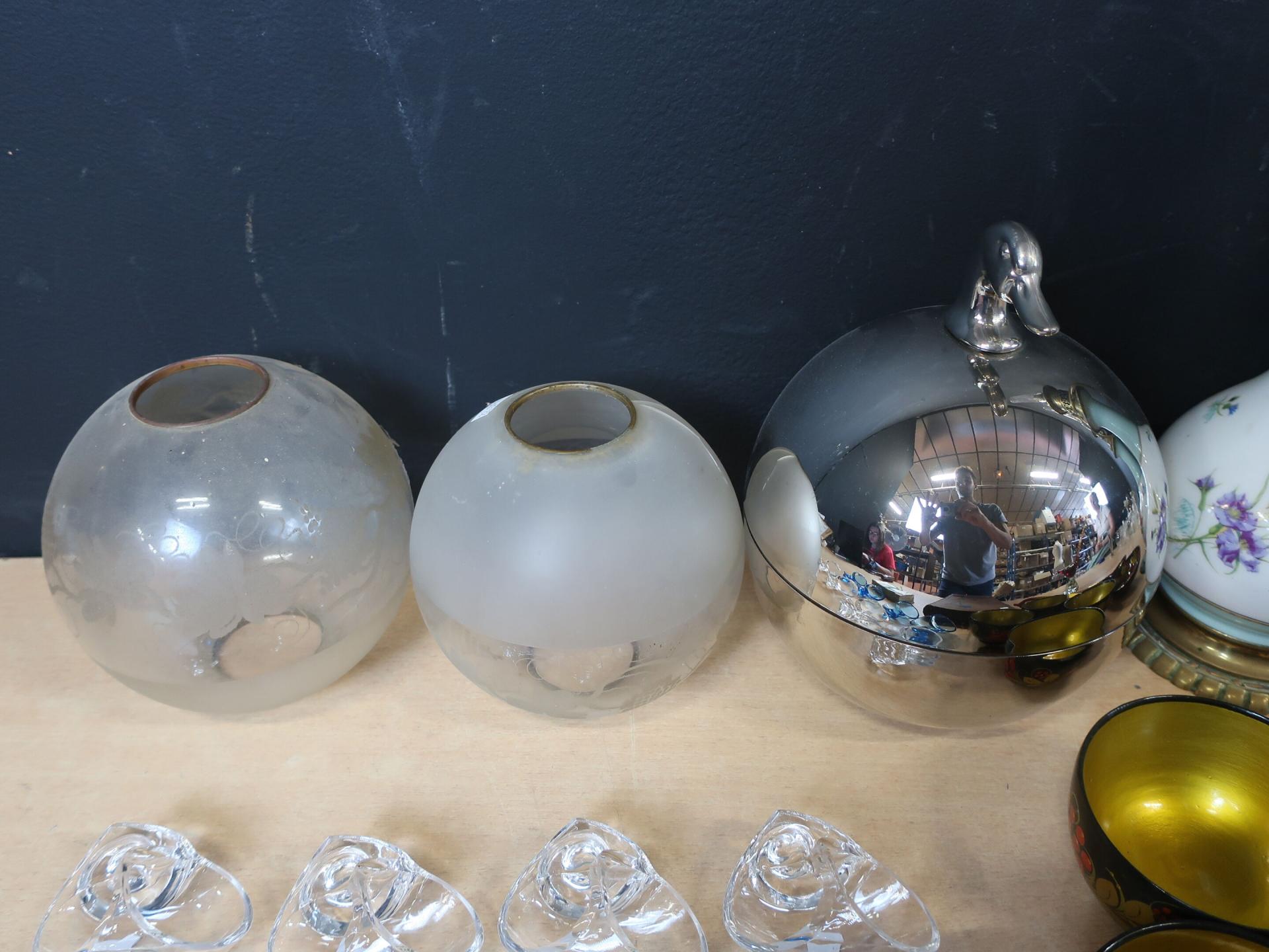Lot d'objets divers comprenant : paire lampes à pétrole avec pied de lampe en porcelaine et laiton (haut: 57cm), un album de cartes postales et petit lot de cartes postales, 3 louches en bois laqué japonais et 4 bols, un oiseau en verre de Murano teinté, 2 globes en verre, une boite isotherme ronde à tête de canard et 8 ronds de serviette de couleur bleus et blancs en plastique.