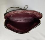 Fermeture par glissière. Deux anses en cuir et chaines de métal doré. Monogramme en métal doré sur tirette en cuir.