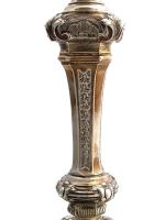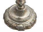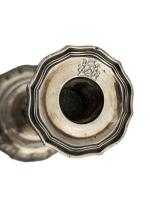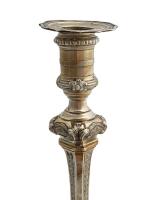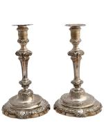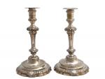 Paire de FLAMBEAUX en argent, reposant sur une base ronde mouvementée moulurée d'une frise d'oves surmontée de joncs à agrafes, le fût à pans annelé à décor de filets, feuillage et coquilles, surmonté d'un binet fileté, la base et les bobèches gravées d'armoiries dans un médaillon lauré