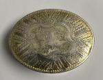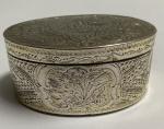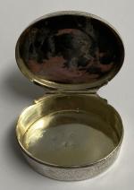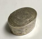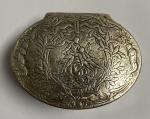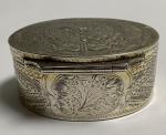 BOITE TABATIERE ovale en argent anciennement vermeillé à riche décor gravé toutes faces de personnages sur un fond rayonnant dans un entourage feuillagé, l'intérieur vermeillé