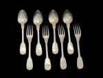 Suite de quatre COUVERTS en argent, modèle filets Minerve. Orfèvre: TV DUTREVIS Poids: 526 gr