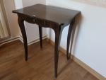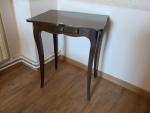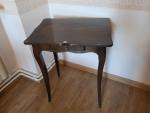 Petite table de style rustique en bois teinté, plateau chantourné, un tiroir en ceinture, pieds cambrés. Long. 60 cm. Prof. 44 cm. H. 72 cm