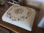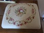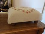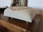 Repose-pieds, garniture au point de croix au modèle du lot précédent, pieds olive. LOT A RETIRER DANS UNE MAISON DE CAMPAGNE DU PAYS D'OTHE (Aube 10) A 20 MIN DE L'HÔTEL DES VENTES DE TROYES.