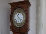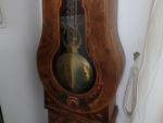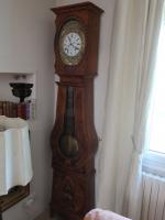 Horloge comtoise époque XIXème siècle à caisse violonnée peint faux bois, à décor peint de fleurs, sur fond faux bois à filets, cadran émaillé signé SENG à Saint Mards en Othe, entourage en laiton repoussé à décor d'oiseaux et corbeille fleurie, balancier à compensation, lyre et lentille (fentes à la caisse et réparations). H. 228 cm. Larg. 49 cm
