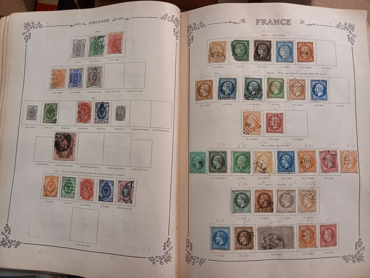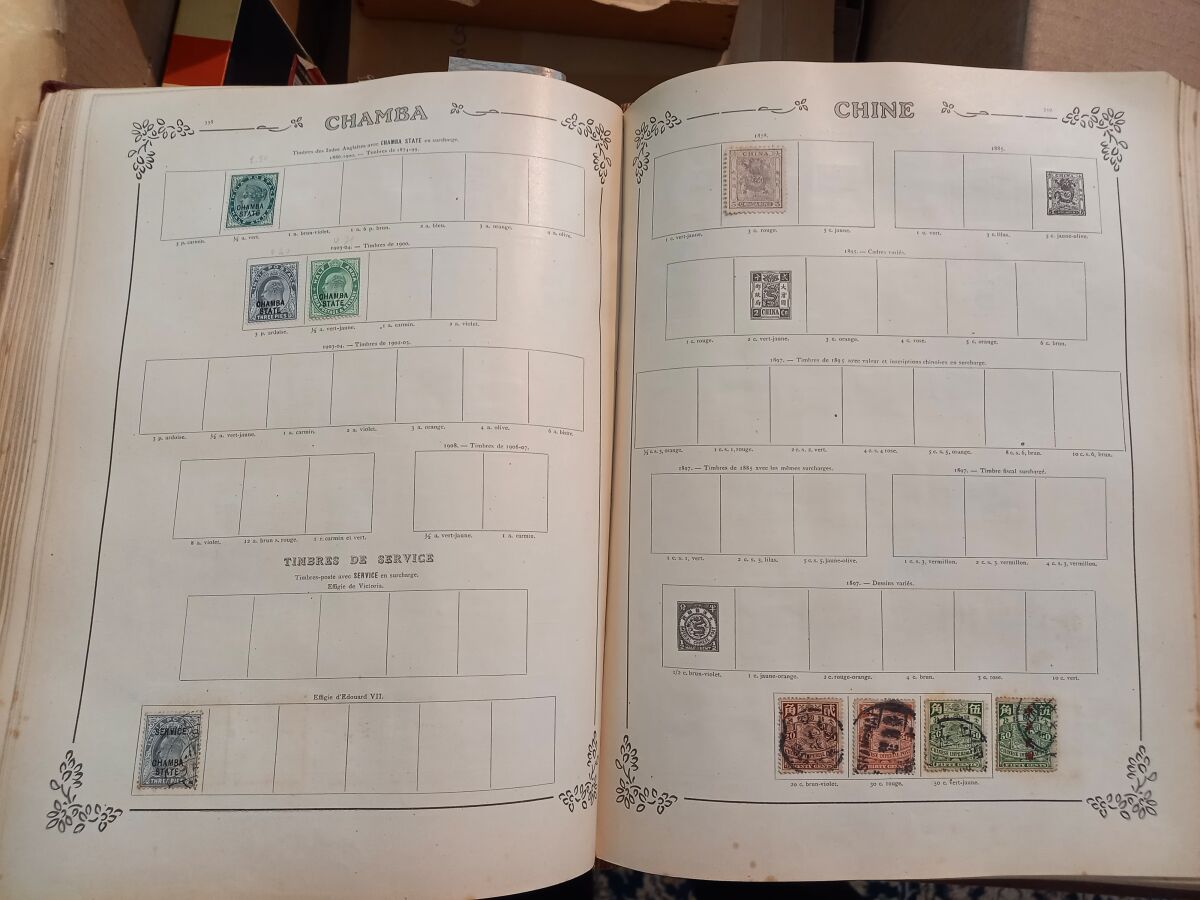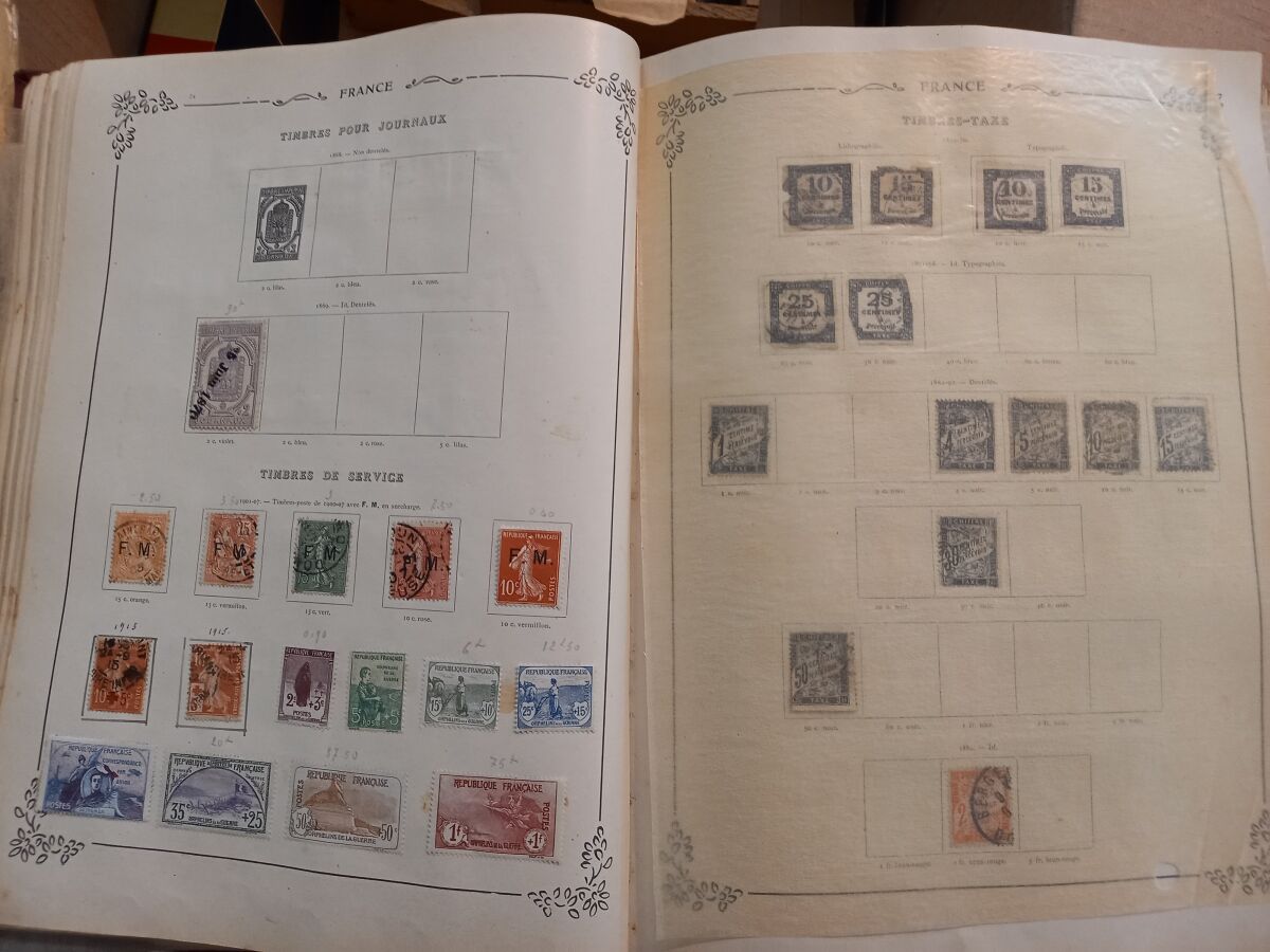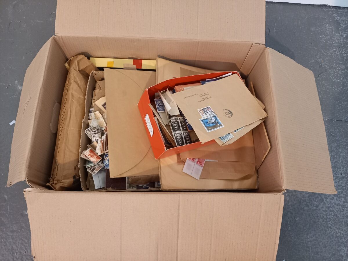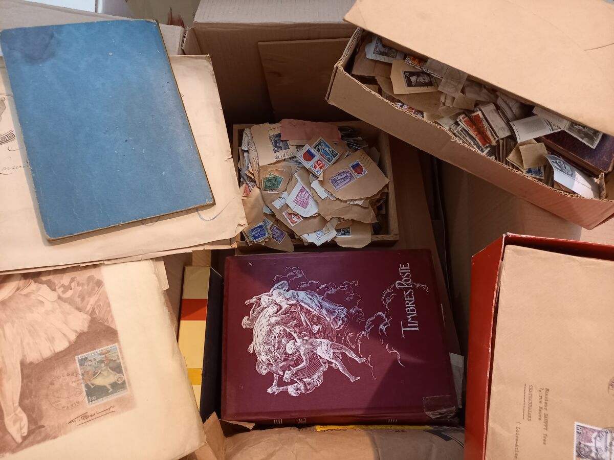 Dans un gros carton, ensemble de timbres de France et Etranger, dont un album de timbres anciens du Monde Entier, tous états