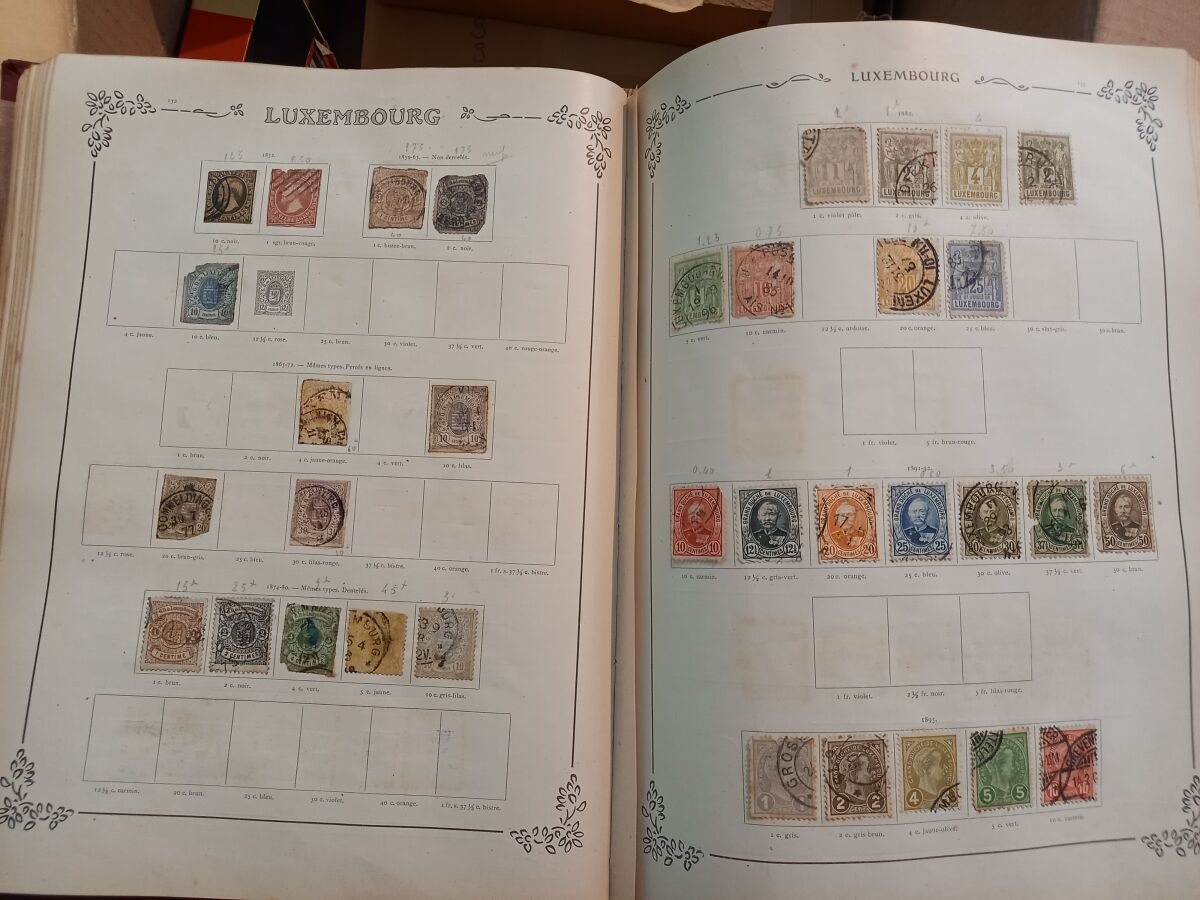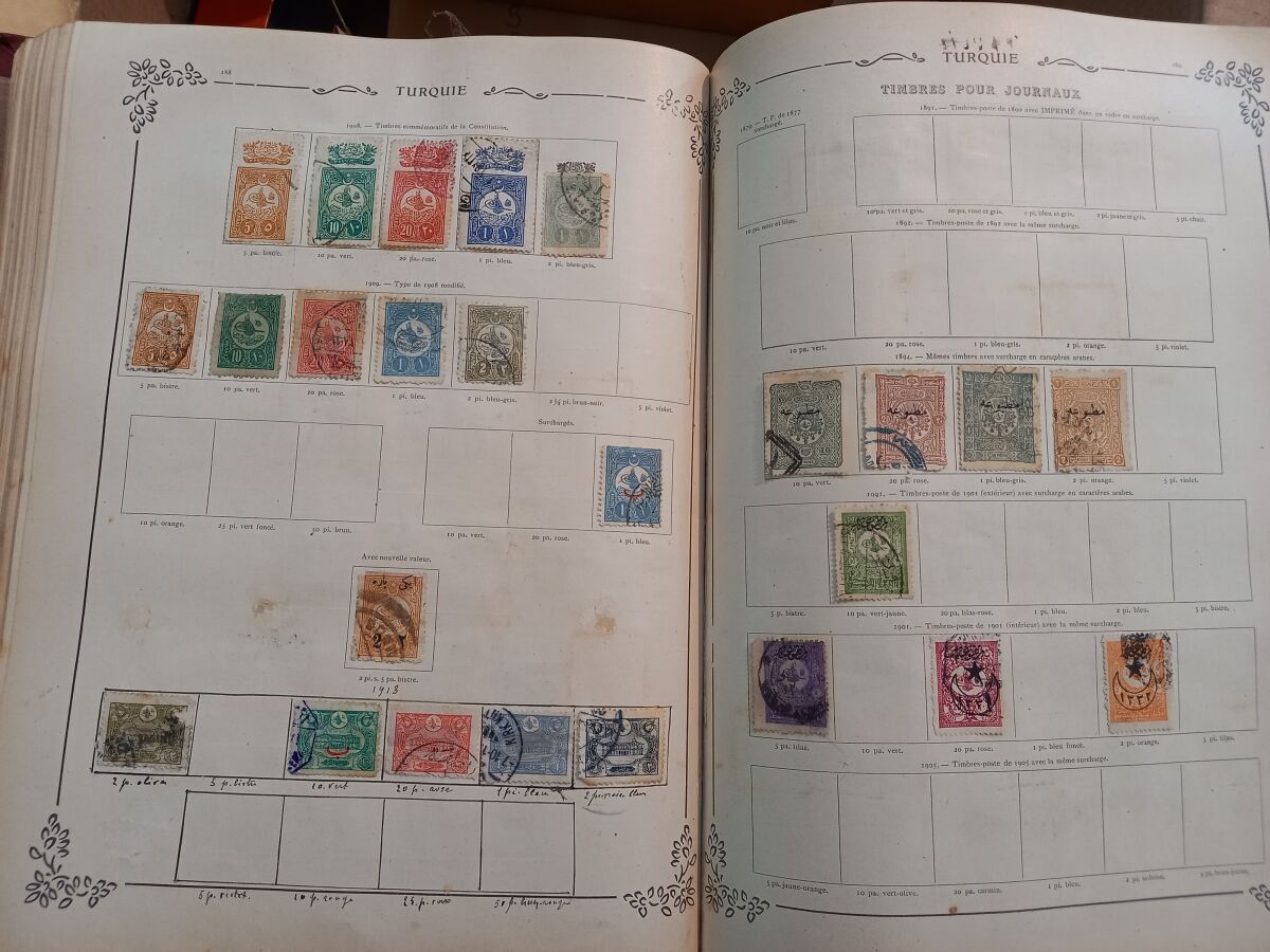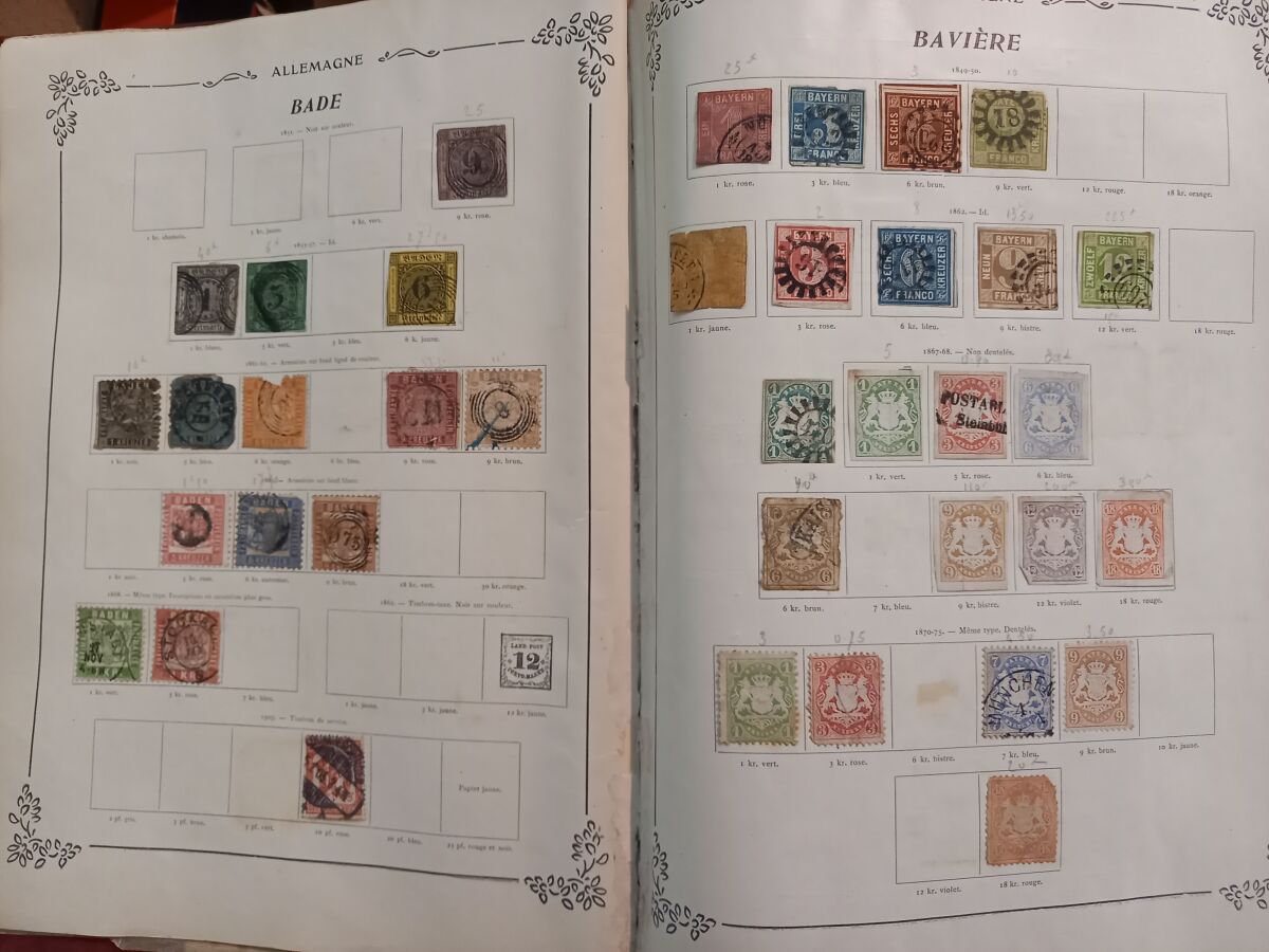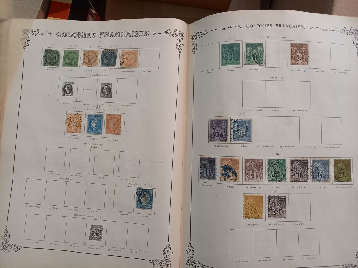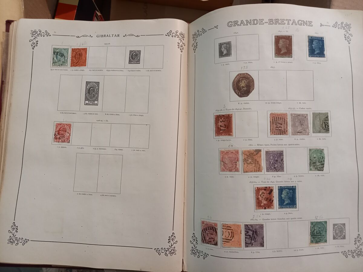 Dans un gros carton, ensemble de timbres de France et Etranger, dont un album de timbres anciens du Monde Entier, tous états