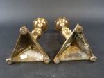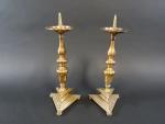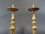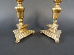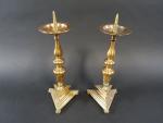 Paire de piques-cierges en bronze, fût tourné sur base triangulaire sur pieds boules aplaties, ép. XVIIème. Haut : 33 cm (restaurations). - 475