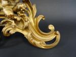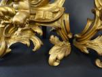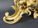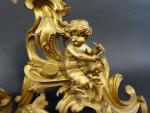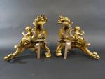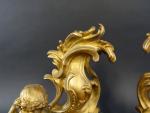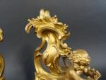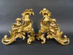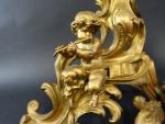 Paire de chenets de style Louis XV en bronze redoré à décor de petits faunes musiciens assis sur une terrasse rocaille. Haut : 33 cm Long : 34 cm