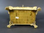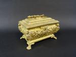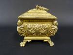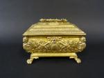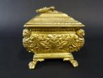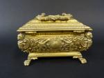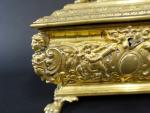 Coffret en bronze de style Renaissance à décor en bas-relief d'amours, rinceaux, animaux fantastiques, angles à cariatides ailées, couvercle orné d'un médaillon à profil féminin, anse mobile. Long : 20 cm Prof : 14 cm Haut avec la poignée : 18 cm - 55