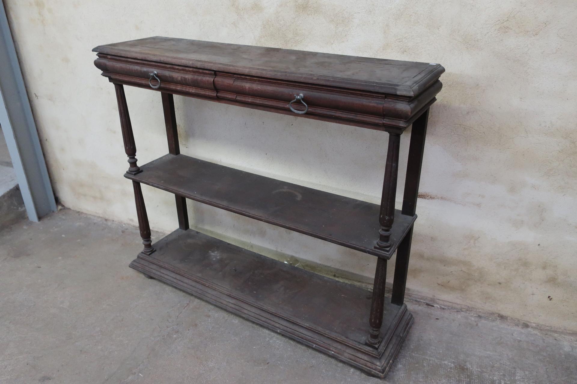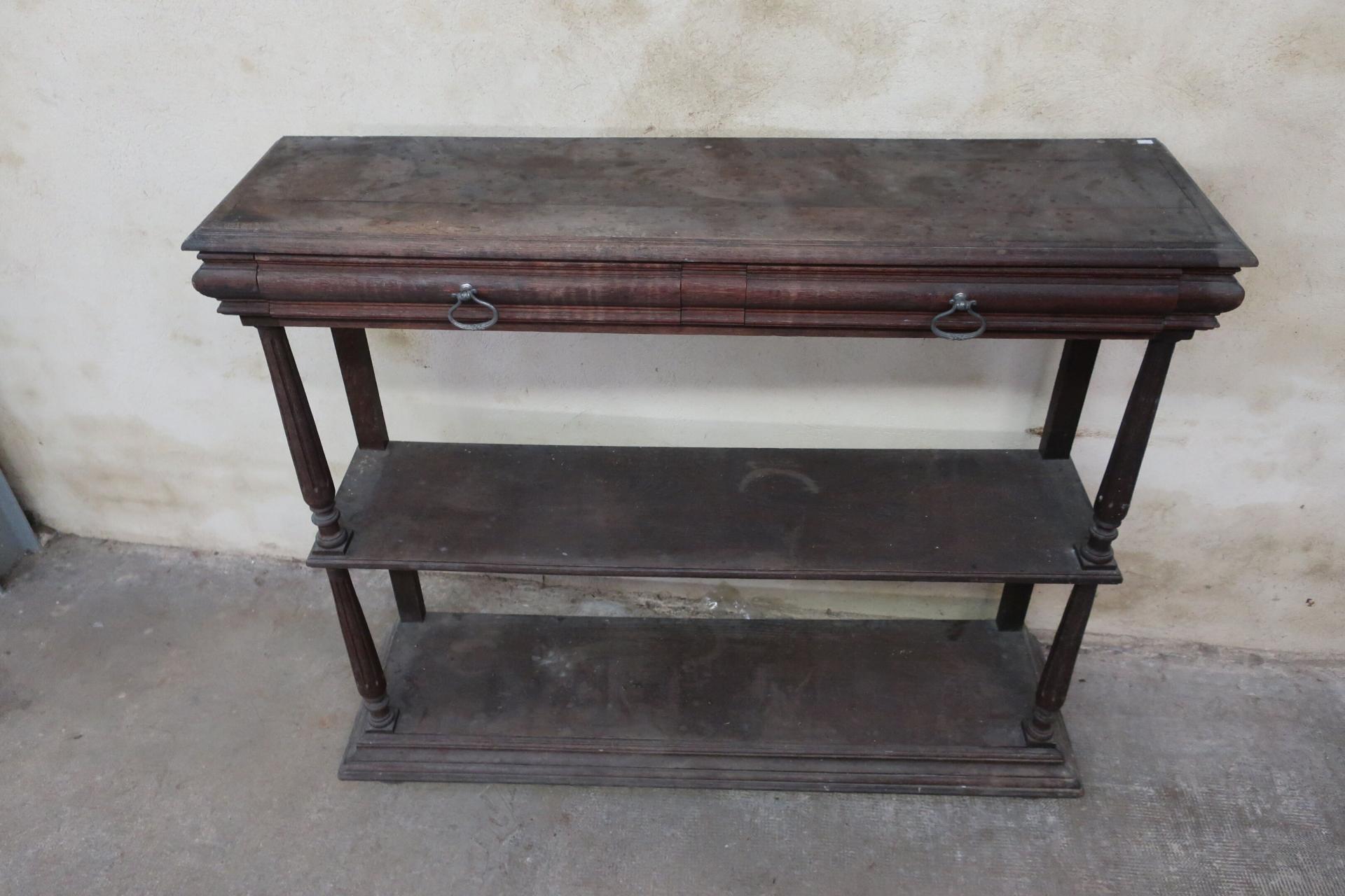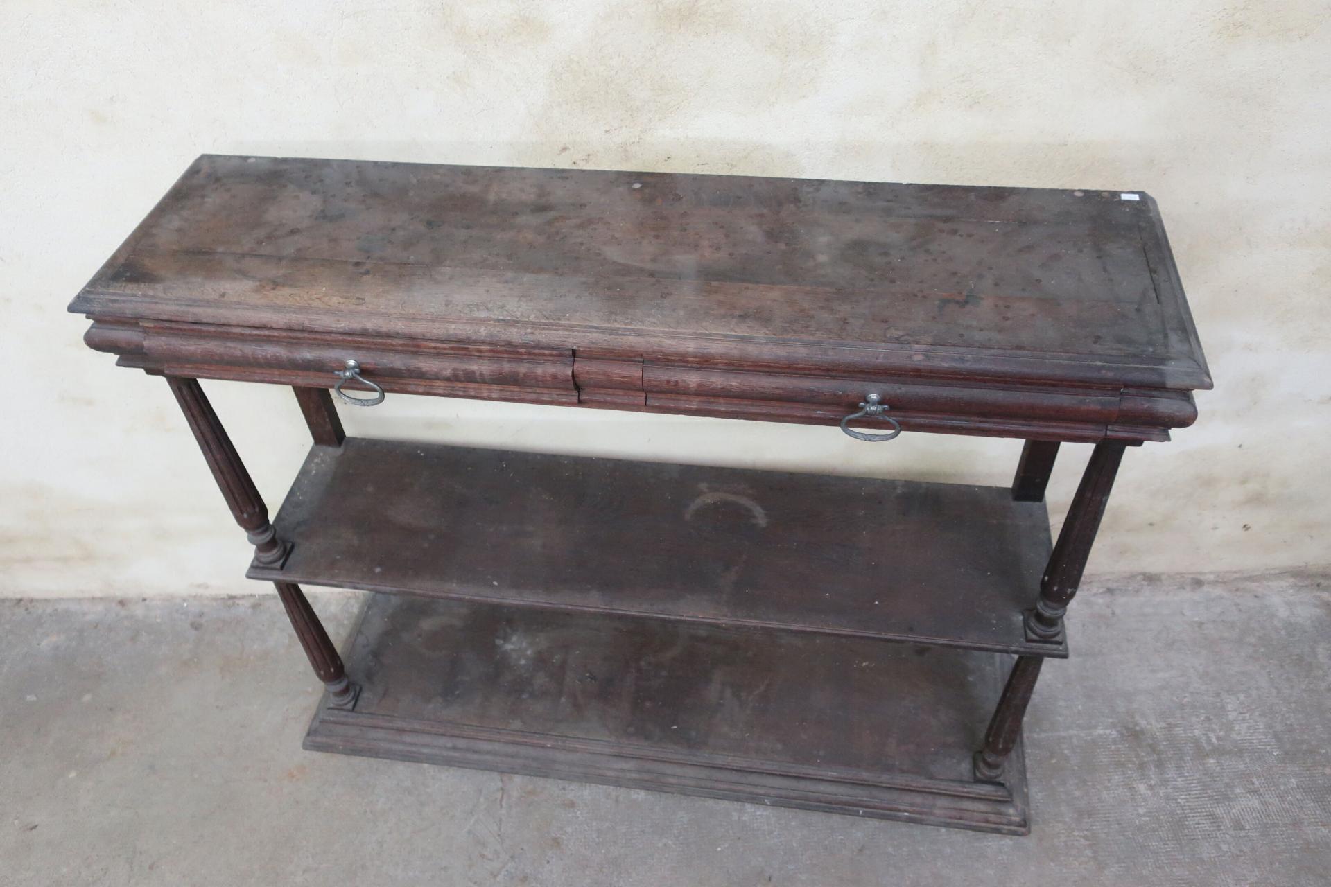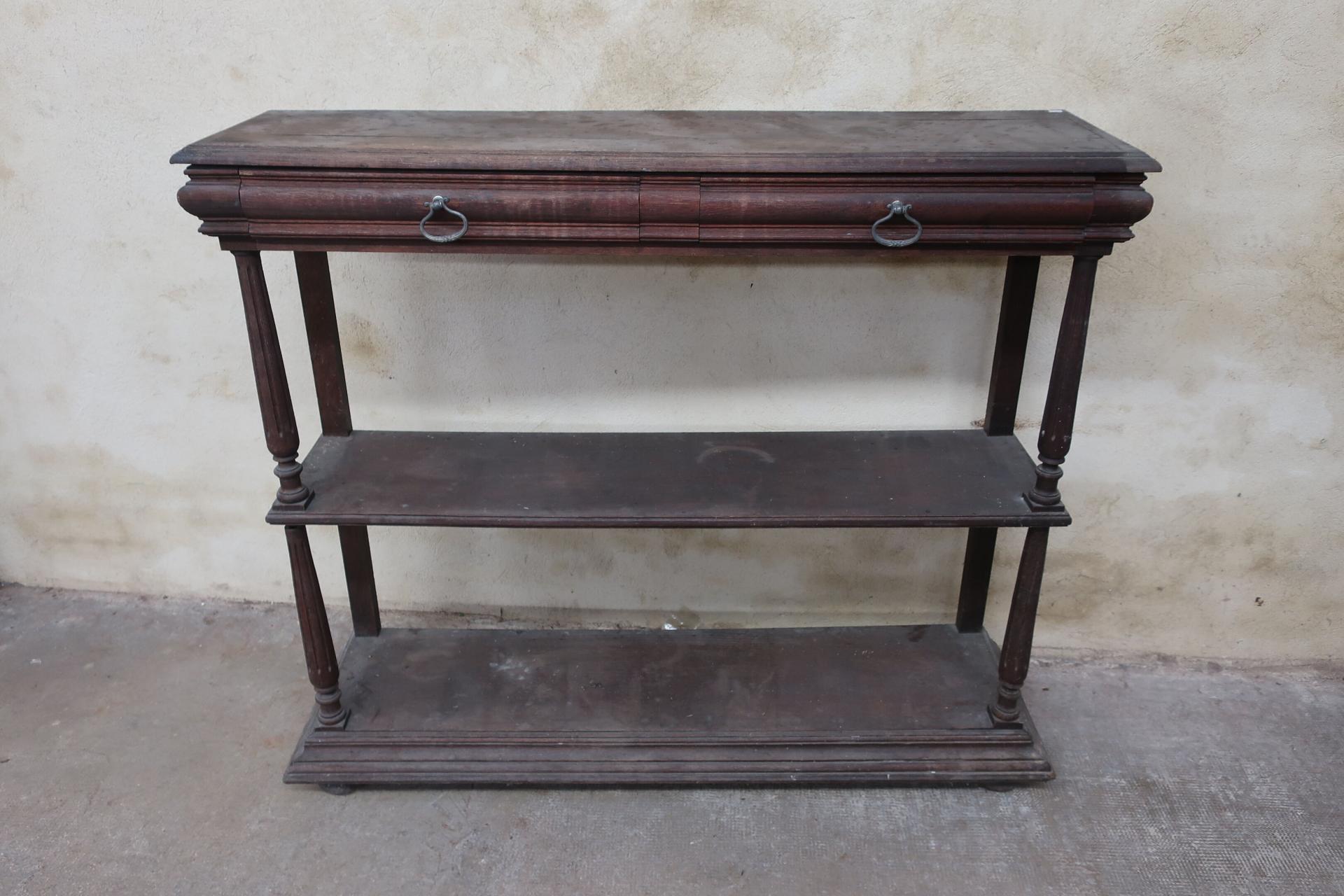 Console à hauteur d'appui de style Henri II en chêne massif ouvrant à deux tiroirs en ceinture et un plateau d'étagère, usures. H. : 115cm ; Longueur : 130 ; Profondeur : 34cm.