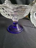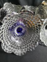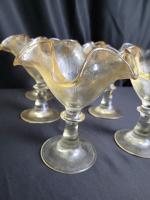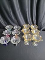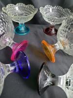 Lot de 12 coupelles en verre moulée pressée dont 6 avec les pieds colorés mesurent 10 cm de haut, 14 cm de diamètre.