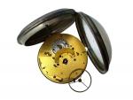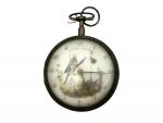 Montre révolutionnaire en argent. Boîtier sur charnière. Cadran émail polychrome avec un soldat de l'armée révolutionnaire, le tambour, un canon, un bonnet phrygien, le drapeau tricolore. Mouvement avec échappement à verge, balancier spiral incomplet, disque de réglage avance et retard.