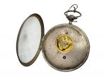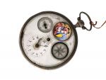 Montre en argent 925 millièmes. Boîtier avec au dos un balancier dit " pendulum " visible au centre du guilloché, disque de réglage avance et retard. Cadran en émail accidenté avec heures et minutes excentrées, petite seconde à 9h, cartouche en émail polychrome à 12h, une petite boussole compas à 3h. Mouvement avec remontage à clef.