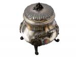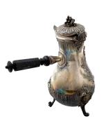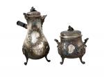 VERSEUSE et SUCRIER en argent à riche décor rocaille avec cartouche, le manche en bois noirci Minerve. Orfèvre: Léon LAPAR (1878-1897) H. max.: 25.5 cm Poids brut: 1 kg 534