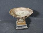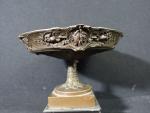 Auguste Maximilien DELAFONTAINE (1813-1892). Belle coupe en bronze à patine brune, au centre une scène mythologique de banquet à l'antique, décor de chars antiques, chiens de chasses, poissons, gibier, grappes de raisin etc... motif de roseaux sur le piétement. Marquées "AD" à l'étoile sur la base, sur un socle en marbre noir. Haut. 25 cm - Diam. 30 cm (usures, manques)