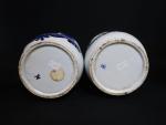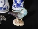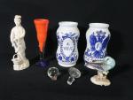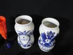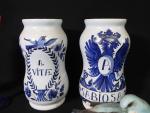 - deux alberalli en faïence de forme balustre en camaïeu de bleu, l'un à décor d'aigle bicéphale, l'autre à décor d'oiseaux et fleurettes marqué A.VITAE (H : 25cm) ;