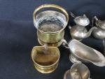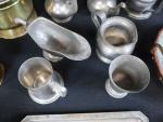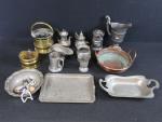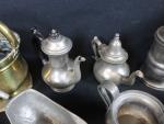 Lot d'objets en cuivre et étain comprenant : 1 pichet ; 2 théières ; 2 choppes ; 1 cruche ; 1 bassine ; 1 gobelet ; 1 saucière ; 1 ravier ; 1 plateau ; 1 plat de présentation à anses mouvementées ; etc.