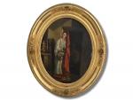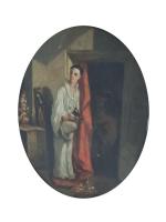 ECOLE FRANCAISE du XIXème Pierrot derrière la porte Huile sur panneau ovale 41 x 32 cm