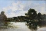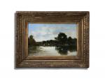 Jules TAVERNIER (1844-1889) Les lavandières Huile sur panneau signée en bas à droite 30 x 43.5 cm